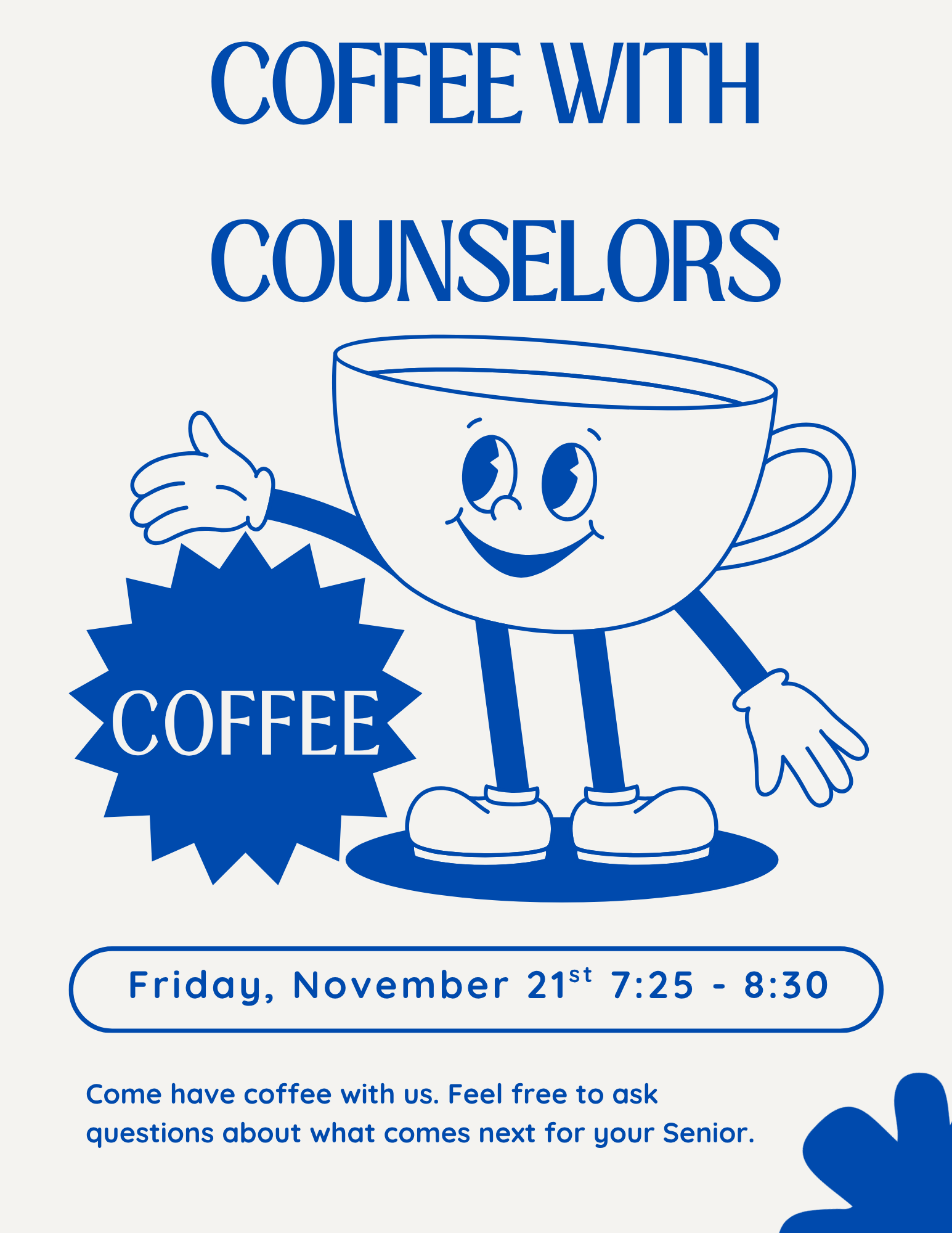 Parents, join us on Friday, November 21st, from 7:30–8:30 AM in the AHS Media Center for our Coffee with the Counselors event!